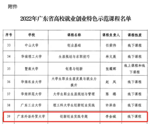 近日,广东省教育厅公布2022年广东省高校就业创业特色示范课程名单。经个人申报、高校推荐和教育厅组织专家评审,广东省属本科高校共遴选了17门课程作为2022年广东省高校创业特色示范课程。伟德国际1946创新创业教育学院申报的《创新创业实践专题》成功入选,这是继创业学院课程入选2021年广东省高校首批创业金课后取得的又一荣誉。