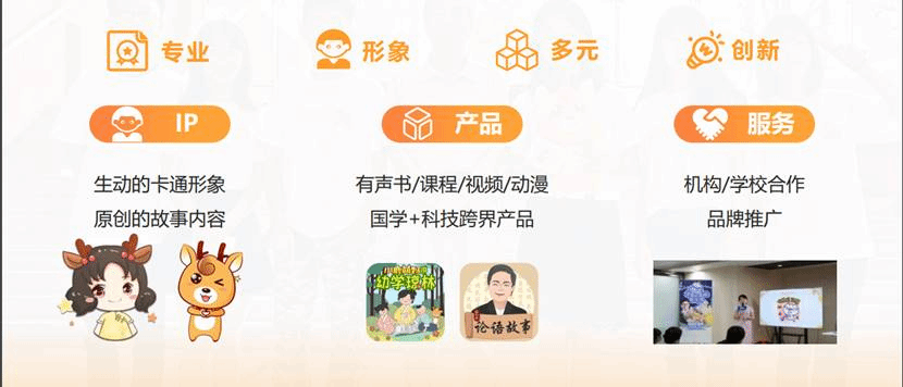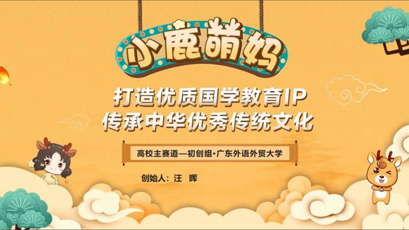 项目简介:“小鹿萌妈”是专注于为3-12岁儿童打造创新优质的国学教育IP产品的少儿国学教育品牌。项目以中华优秀传统文化为核心,用创新的互联网传播方式,将IP产品作为中华文化的载体,用普通话、粤语和英语等多语言的方式,输出原创IP产品。截至2020年10月,“小鹿萌妈”全网累计粉丝58.9万名,专辑播放量超两亿次,成为新一代儿童喜爱的国学品牌,走入万千家庭。