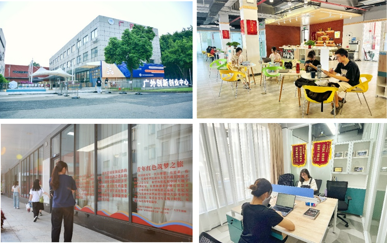 左下:创新创业红色长廊;右下:学生团队办公室)