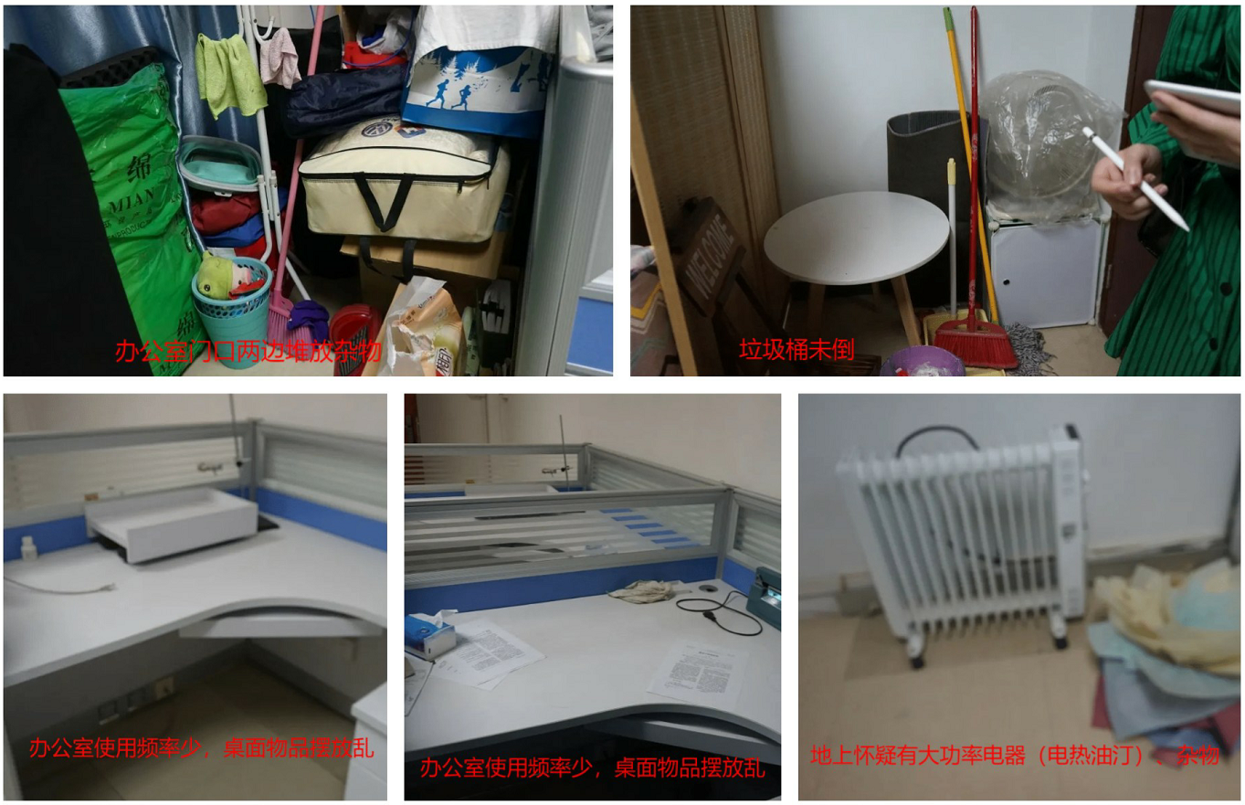 (5)创业实践基地检查存以下问题:门口两边过多物资堆积,摆放稍显杂乱、垃圾桶没有倒;办公室使用频率少;地上怀疑有大功率电器(电热油汀)、杂物。
