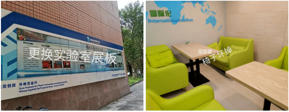 (4)南校E座实验室检查存在以下问题:门口宣传栏内容陈旧,休息区沙发脚坏了。