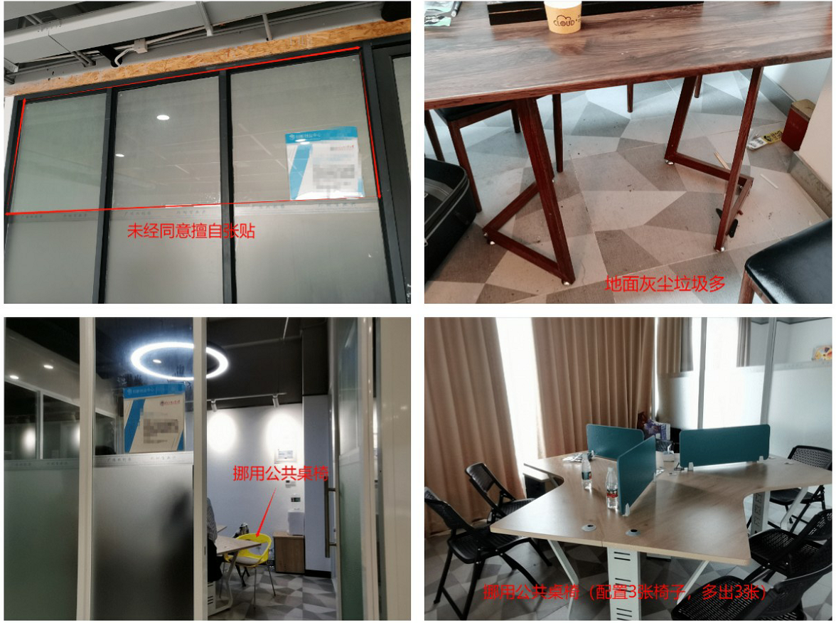 (2)创业中心创业团队办公室检查存以下问题:挪用公共桌椅、个别办公室内卫生较差,地面灰尘垃圾多、物品乱堆放、未经同意擅自张贴、个别办公室空置使用频率不高等。