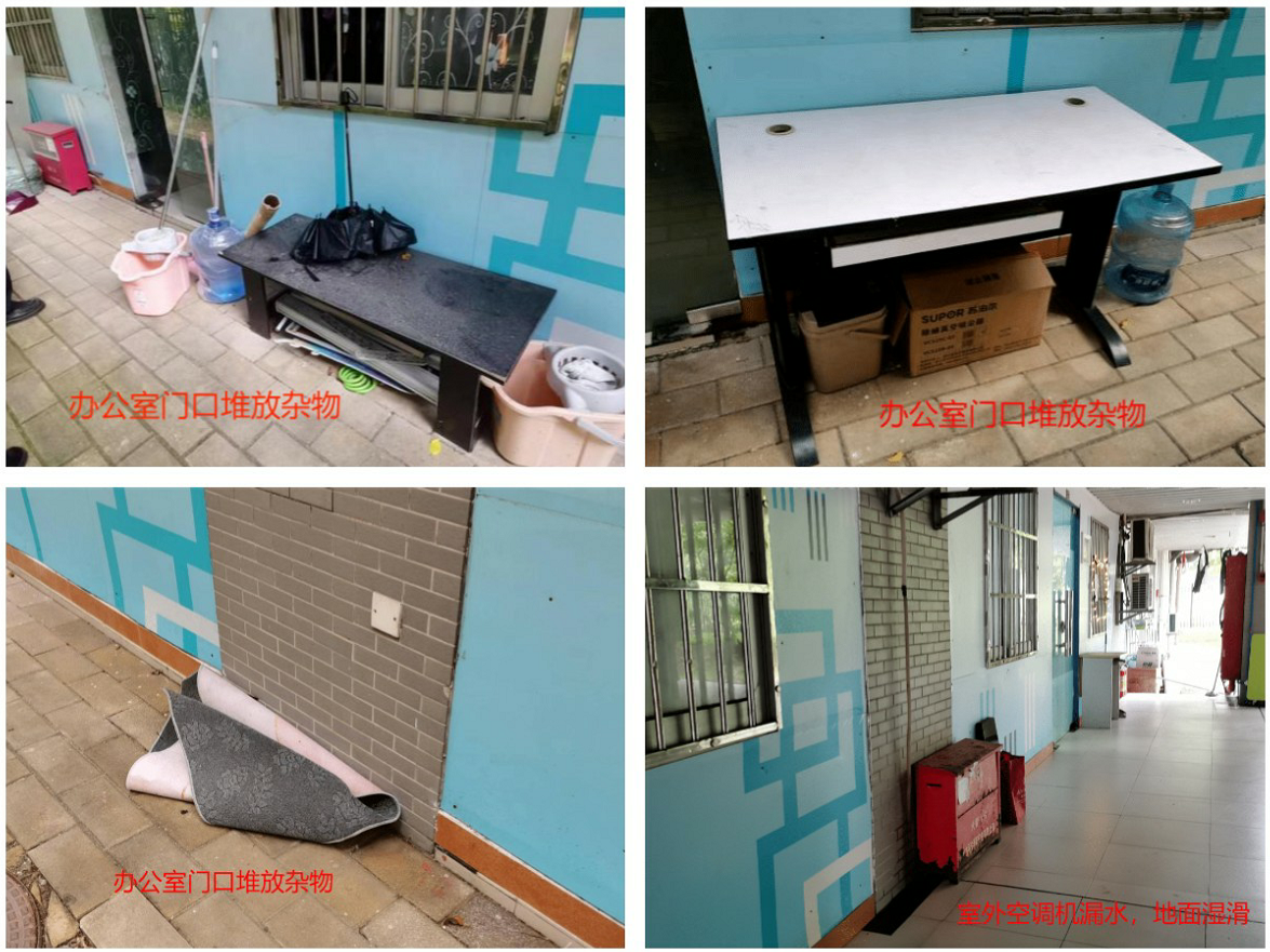 处理意见:办公室门口物品搬进室内或清理掉,增加接水桶等容器并及时将水清倒,切勿直接排到地面,保持地面干爽。